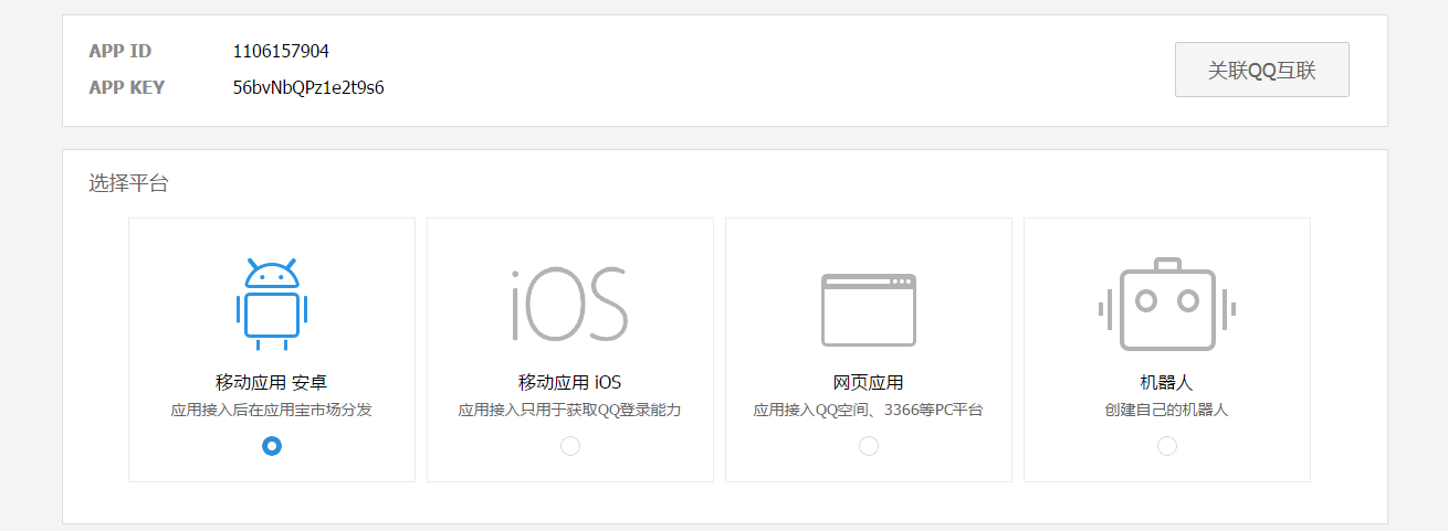 2)创建应用:开放平台的首页选择“应用接入-->应用接入”,创建后就得到“APP ID”和“APP KEY”。不用提交应用审核,QQ有安卓和IOS应用建两套应用绑定;